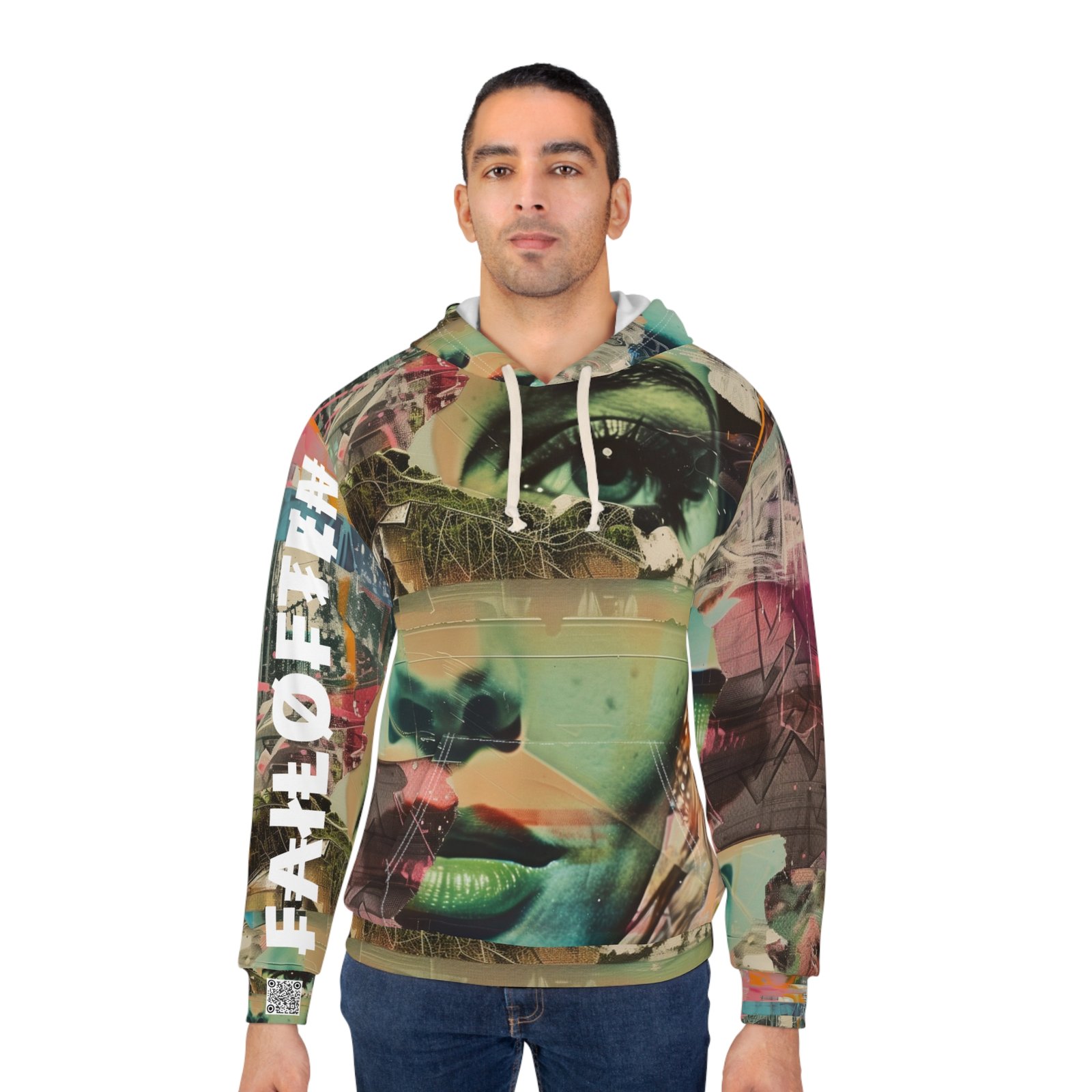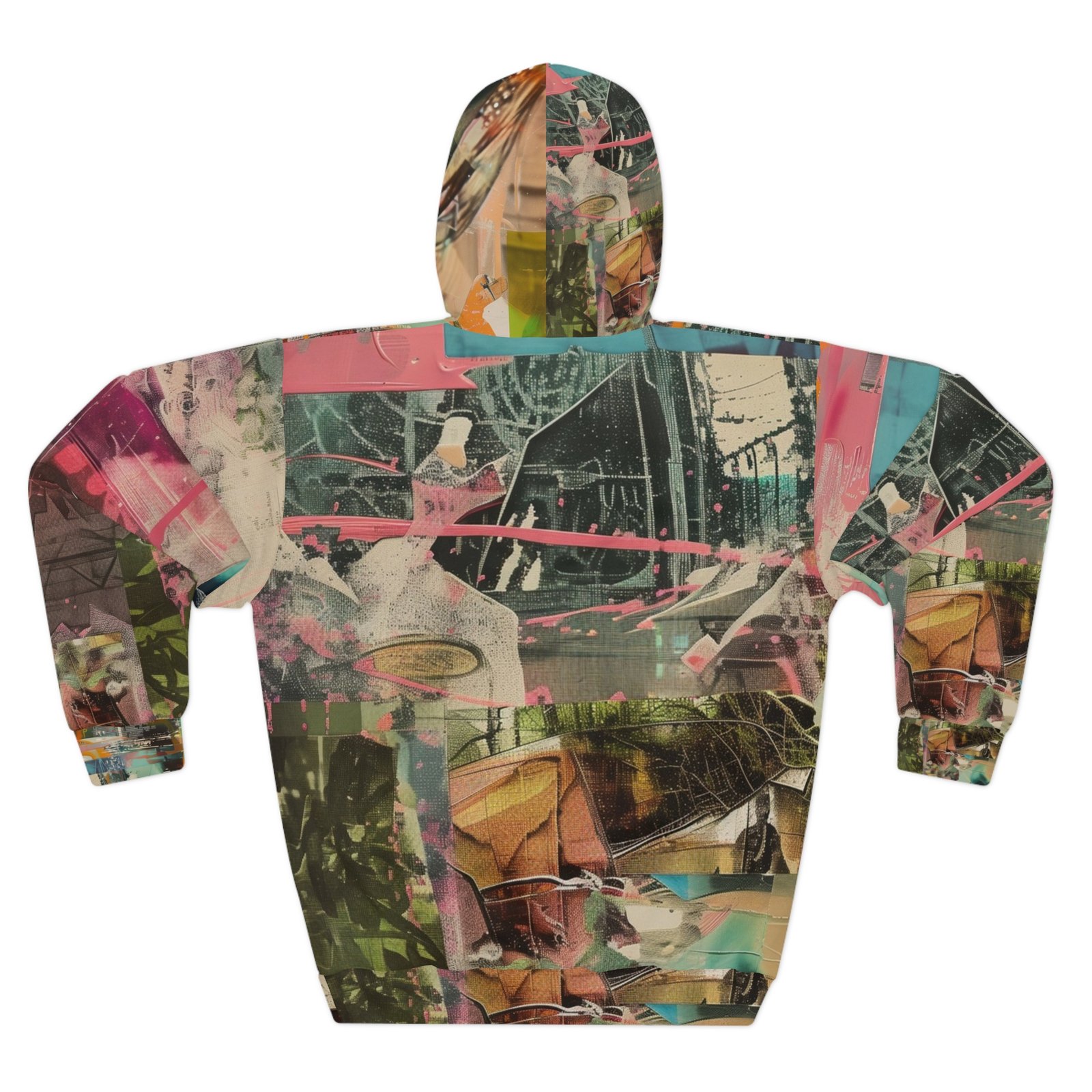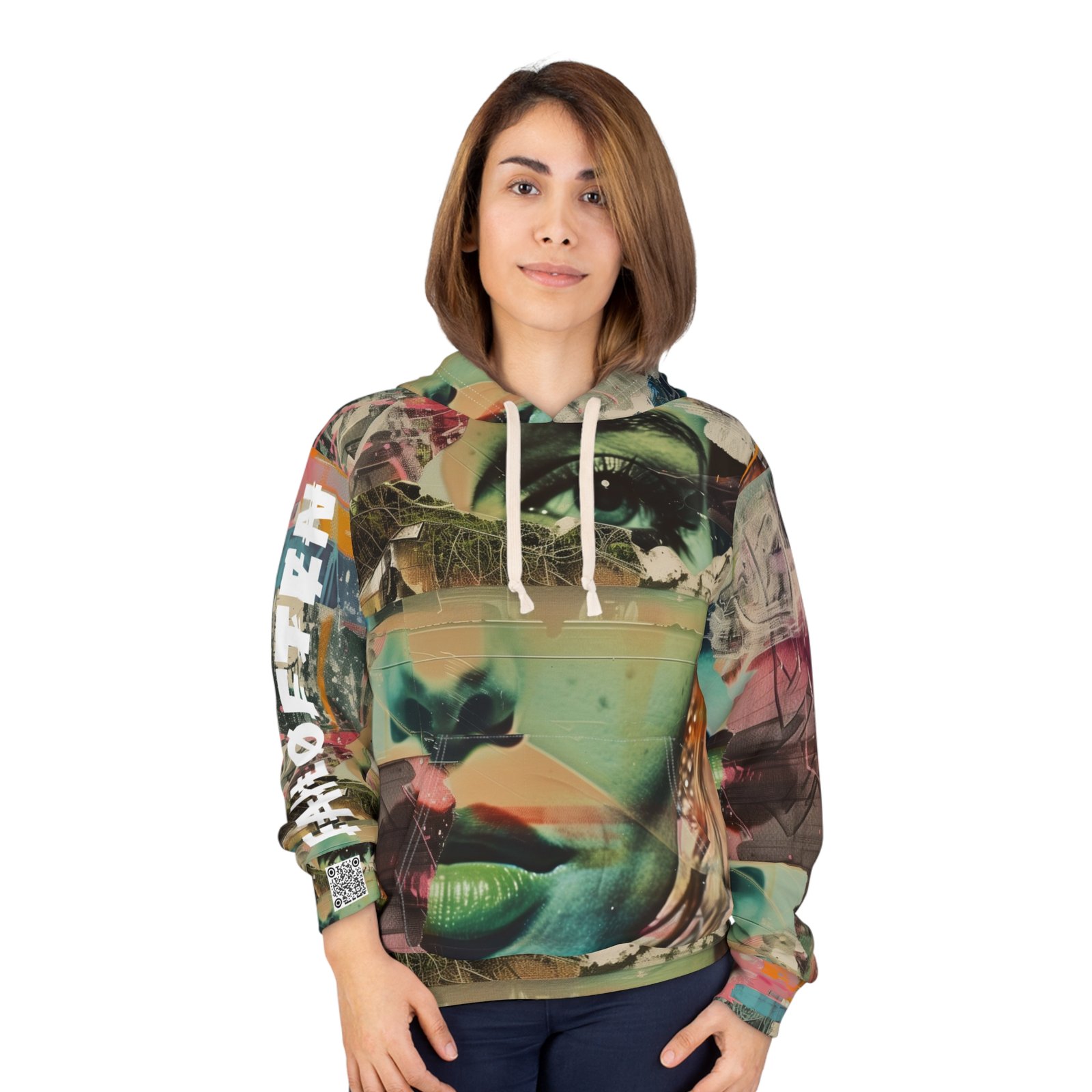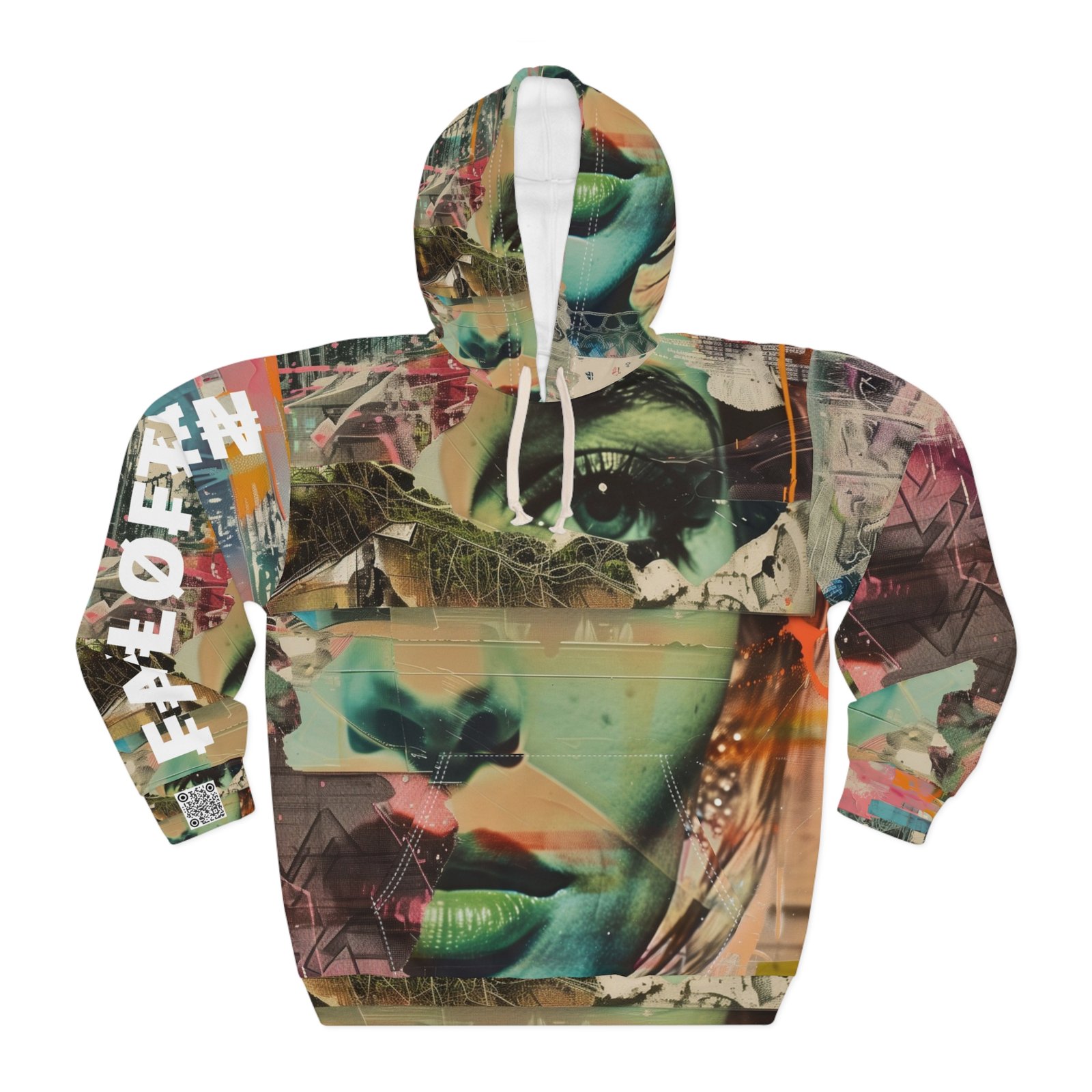 A grungy hoodie featuring an AI woman and nature collage, giving off a cool and edgy vibe. Perfect for those who appreciate unique and artistic designs. Ideal for casual wear or as a statement piece during festivals or music concerts.